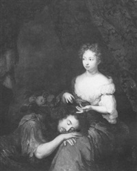 Tempera colors, gold, silver paint, and delilah tying samson's hair to a column;